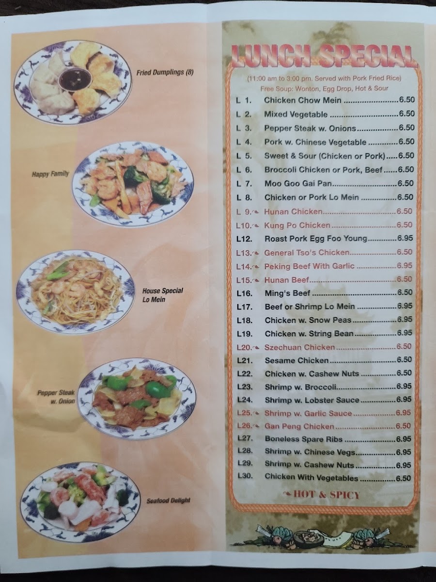 The chef’s specials steal the show, featuring favorites like the General Tso's Chicken—crispy, sweet, and perfectly sauced for only $14.95—and the delightful Happy Family ($18.95), a sumptuous stir-fry of shrimp, chicken, beef, and scallops in a rich brown sauce.